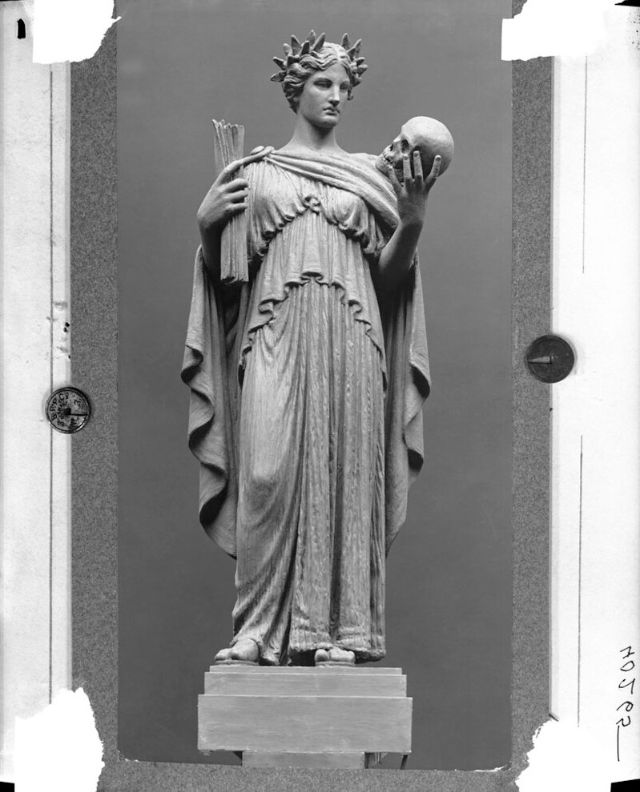 Statue representing Science by Henry Hering, female figure holding a skull and a book, for Northwest corner of Stanley Field Hall, 1919