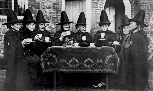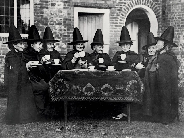 This photograph, taken around 1920, shows eight women dressed in black capes and tall, pointed hats, enjoying tea outdoors. Despite their appearance, which strongly resembles the popular image of witches, they were not a coven. They were the members of the Holy and Undivided Trinity of Castle Rising, an almshouse charity located in Castle Rising, Norfolk, England.