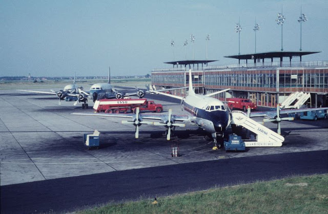 Belgium. Brussels National Airport, Vickers Viscount of BEA, DC-6 of SABENA and an unidentified Caravelle, 1961