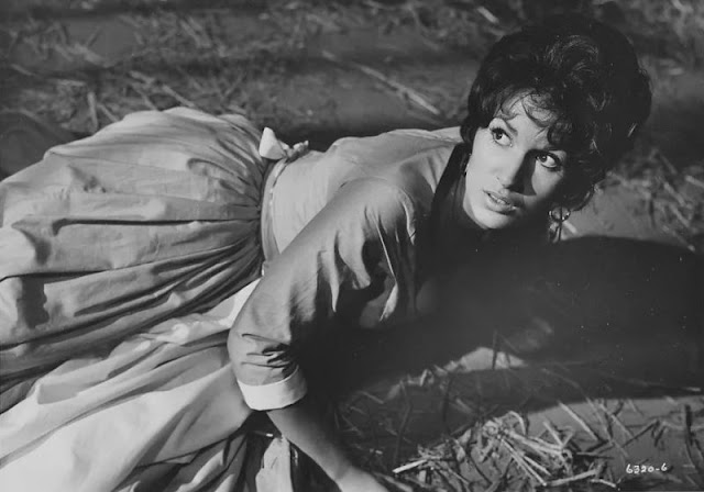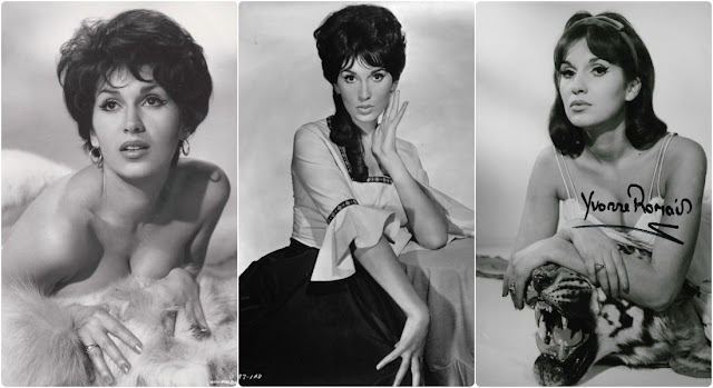 Born 1938 in London, British actress Yvonne Romain appeared in children’s shows and repertory at the age of twelve. She started appearing in British films in her late teens. Her exotic, dark looks and 38-22-36 figure saw her often cast in supporting roles as Italian or Spanish maidens in war films and comedies.