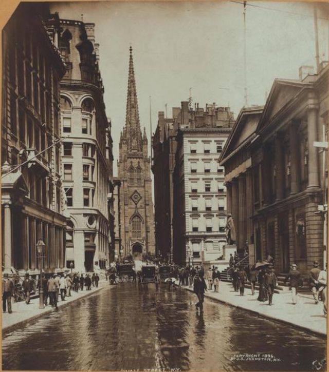 Wall Street, west across Broad (left) and Nassau (right) Street’s, to Broadway, 1894