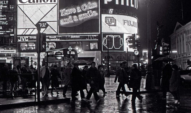The bright neon lights at Piccadilly Circus shine on people enjoying London’s nightlife in 1979.