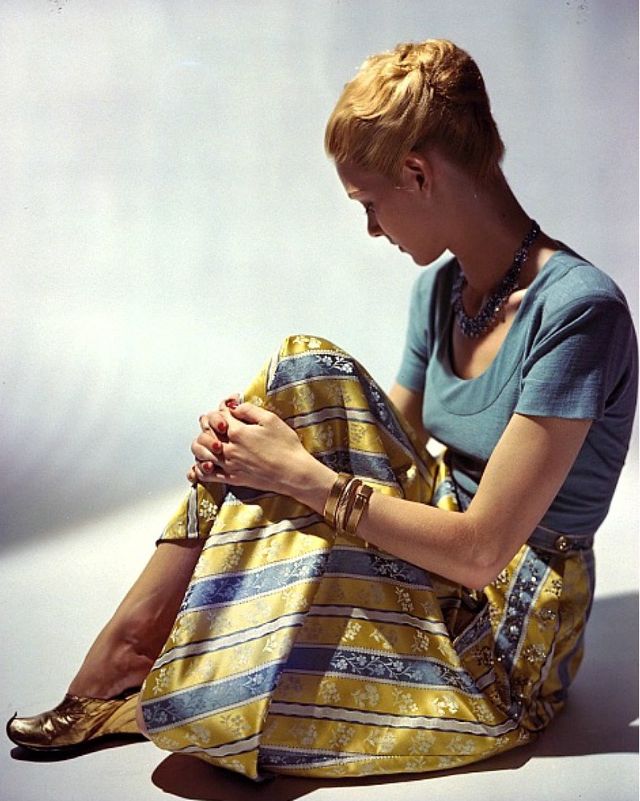 | Model wearing light blue wool jersey together with skirt of printed rayon damask, detailed with sequins, all from Tina Leser, photo by Constantin Joffé, Vogue, October 1, 1944 |