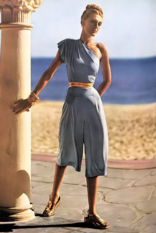 | Bijou Barrington in bare-shouldershort dinner pyjamas of Celanese rayon by Tina Leser, gold kid belt by Schaffer, photo by Serge Balkin, Vogue, June 1, 1945 |