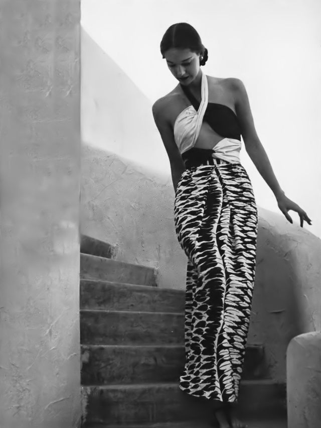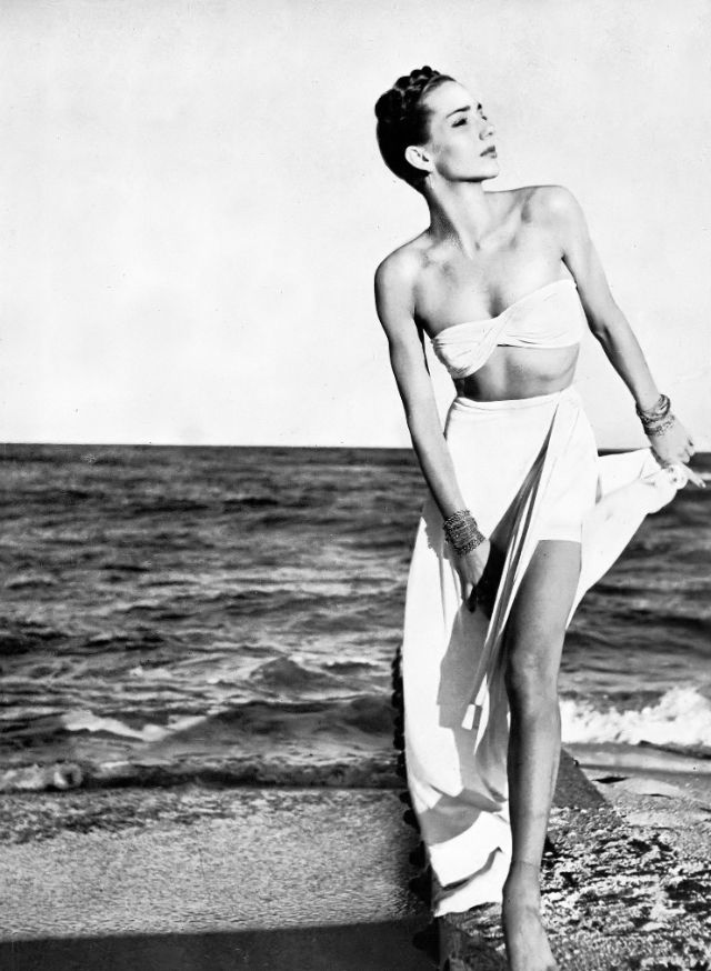 | Model in stone-white rayon-jersey two-piece swimsuit with long wrap-around skirt for evening by Tina Leser, jewelry from Lampl, photo by Louise Dahl-Wolfe, Harper’s Bazaar, June 1945 |
