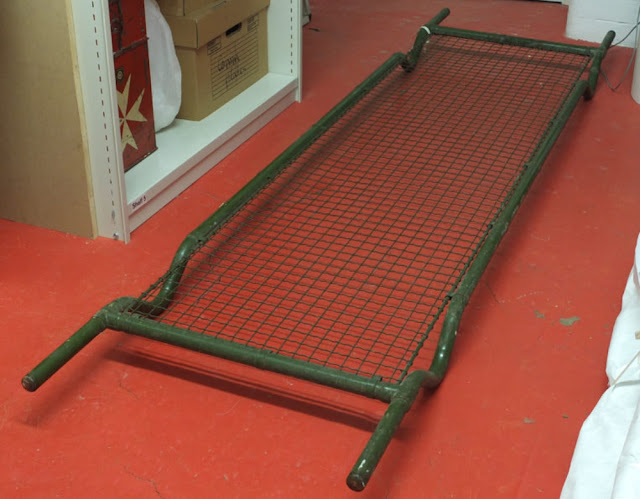 The stretchers were made from steel so that they could be easily washed down after use and used again when necessary. They had a wire mesh within the frame and two indents either side so that they were raised slightly off the ground if they had to be set down while an injured person was being transported. Most were painted green when used as stretchers, but are black in their recycled life as railings.