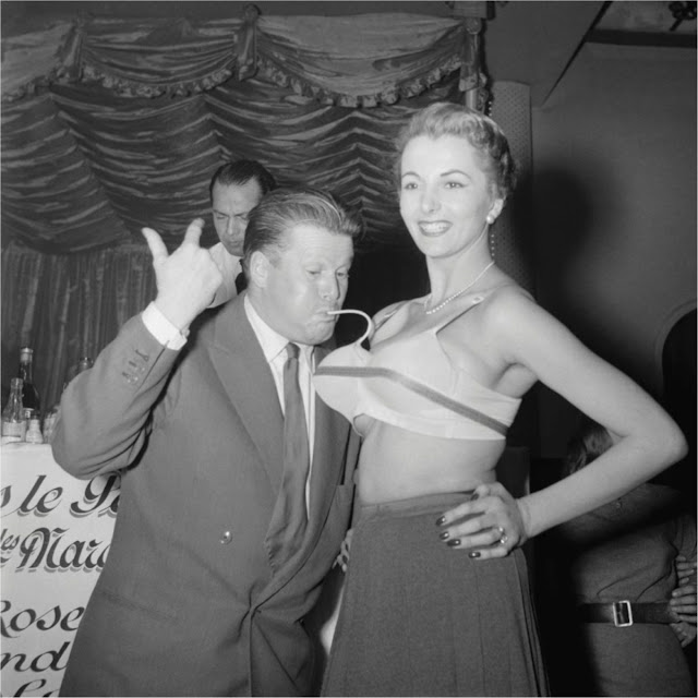 November 1952, and the inflatable bra comes to France for the first time. Here, French TV celebrity Jacques Angelvin demonstrates the proper method for inflating it. Angelvin was later arrested for drug trafficking in 1962.