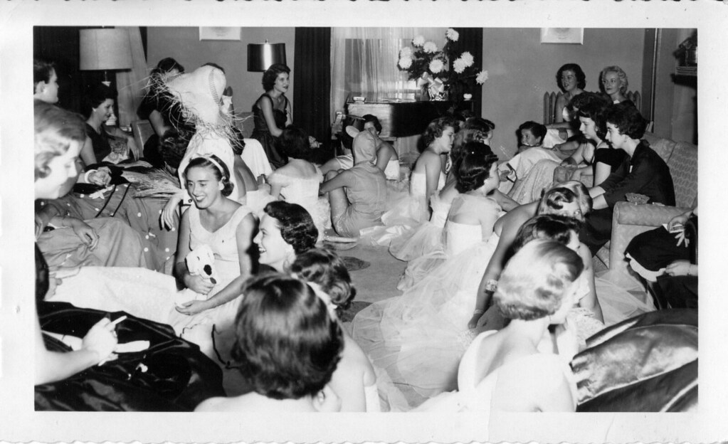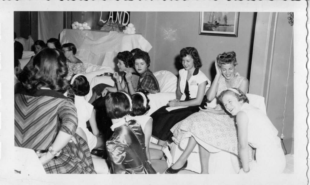 Also, there are typically one to two days during recruitment when sororities preform skits for potential new members (then called rushees), which could explain the girls in top hats and maybe some of the Wizard of Oz costumes. One of the photos depicts many of the women on the steps of the sorority house who appear to be singing. Door chants are common during recruitment and are/were often preformed as depicted. All of the members would stand either inside or outside the house to do a chant on behalf of the sisterhood for new members before mixers/parties. Also, it is customary to wear whites and do door chants on bid day – the day where new members receive cards extending an invitation to become a member of the sorority.