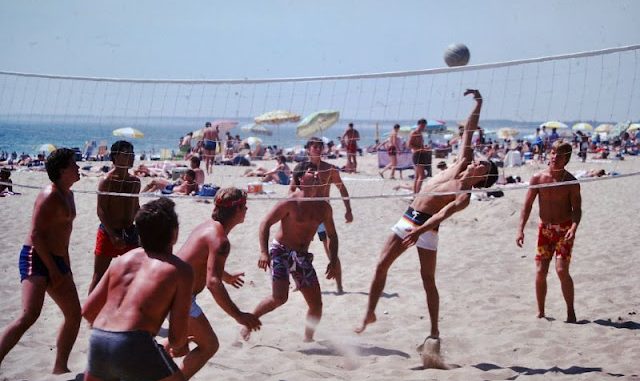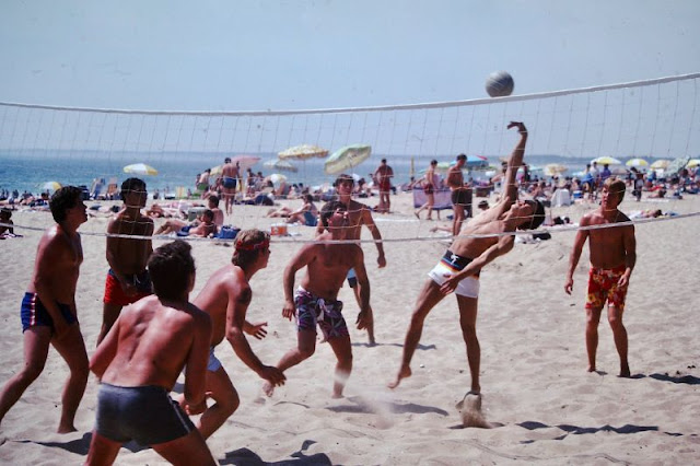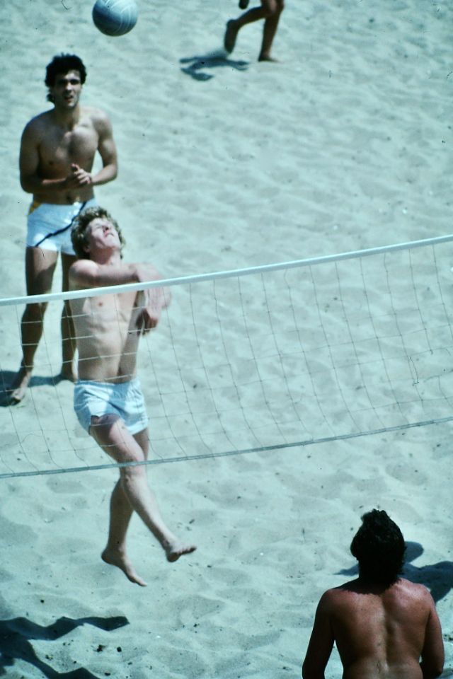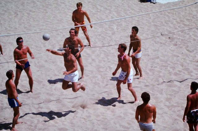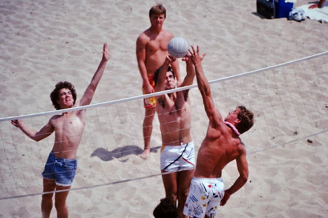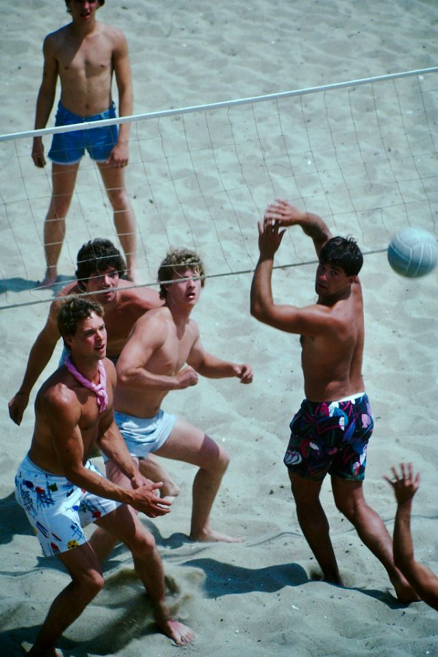These photos were found by Mark Susina that captured guys playing volleyball on beach in the 1980s.
