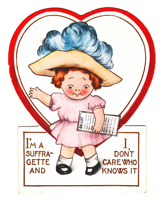 | 1900 – Suffrage-era, die-cut Valentine card, depicting a small girl wearing a “Mother Hubbard” hat and holding a box-sign with the text “Votes For Women, Vote For Me For A Valentine.” |
