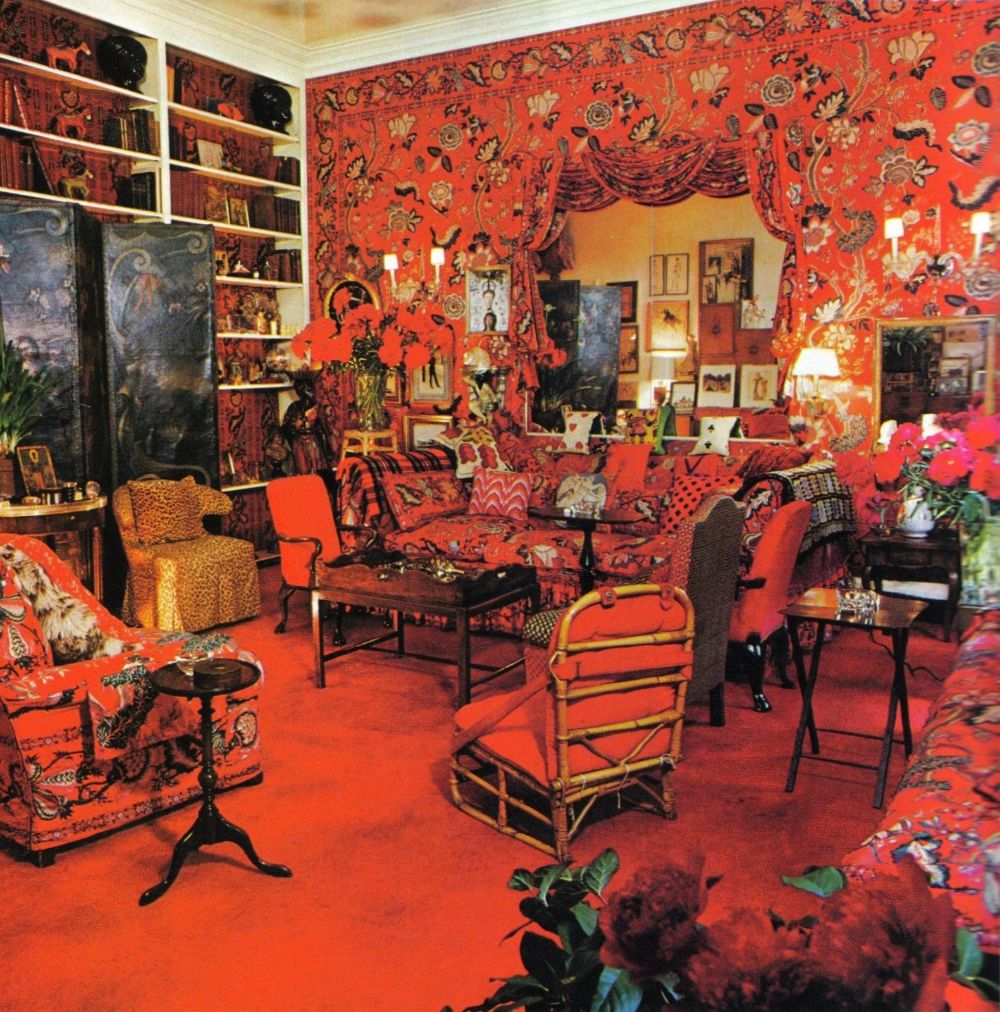 The end result was completely bloodred. Scarlet chintz covered with brilliant Persian flowers draped the room. Piles of patterned red pillows, a thick scarlet carpet, and a mix of red accessories completed the monochromatic look. As Vreeland pointed out, “Red is the great clarifier – bright and revealing. I can’t imagine becoming bored with red, it would be like becoming bored with the person you love.”