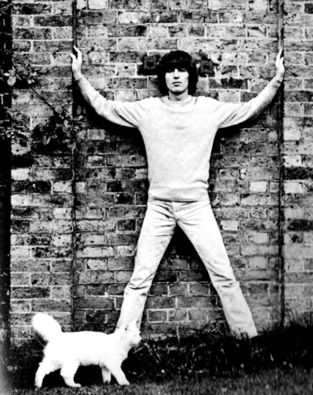 George Harrison photographed with his cat, Korky at Kinfauns, Surrey, England, 1965. This famous photo session took place at his home, Kinfauns and was for The Beatles Monthly. The photographer was Leslie Bryce.