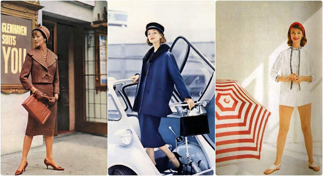 Dolores Hawkins in summery white piqué shorts and sleeveless top worn with its own jacket trimmed with navy ribbon, by Jo Collins, photo by Francesco Scavullo, 1956