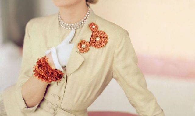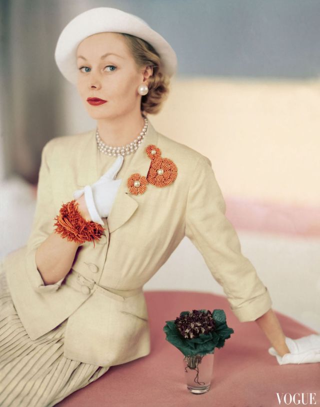 Nina de Voogt wearing a silk cream suit, photo by Horst P. Horst, US Vogue, March 15, 1951