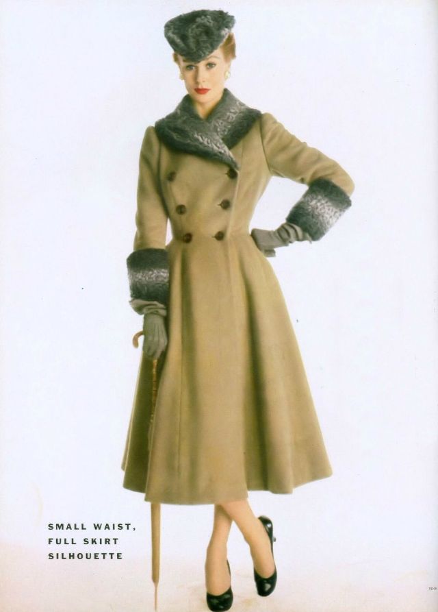 Nina de Voogt in camelhair coat with gray Persian lamb collar and cuffs by Traina-Norell, Persian lamb tri-corn by Braagard, photo by Irving Penn, Vogue, September 1, 1951