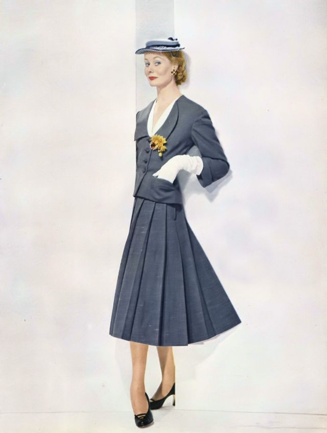 Nina de Voogt in a suit that doubles as a dress in gray nubbed worsted by Ben Zuckerman, hat by Sally Victor, photo by Erwin Blumenfeld, Vogue, January 1, 1952