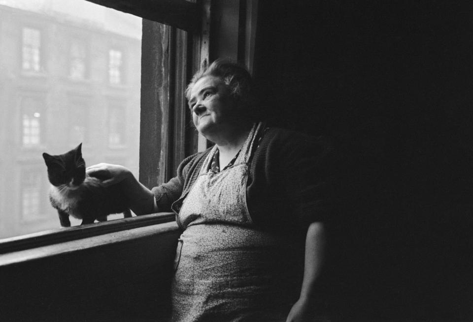 A Glaswegian woman peers out of the window as she pets her cat