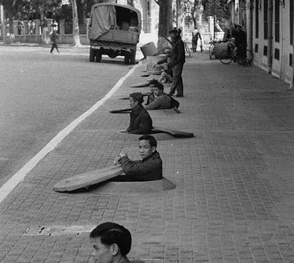 This image captures a stark reality of daily life in Hanoi, North Vietnam, in 1967 during the Vietnam War. The photo shows residents sheltering in narrow, chest-deep individual air-raid bunkers (often called “turtle-shell” shelters) dug directly into the sidewalks. These bunkers were a critical part of the city’s civil defense strategy during the U.S. bombing campaign known as Operation Rolling Thunder. The photograph was taken by Lee Lockwood, an American photojournalist for Life magazine. He was the first American reporter permitted to document daily life in North Vietnam since 1954.