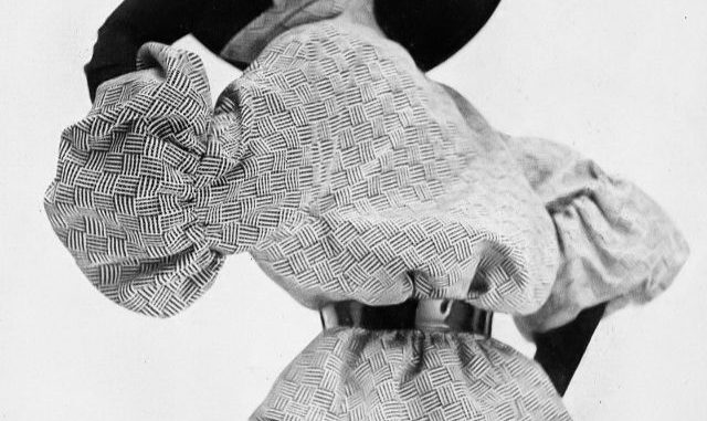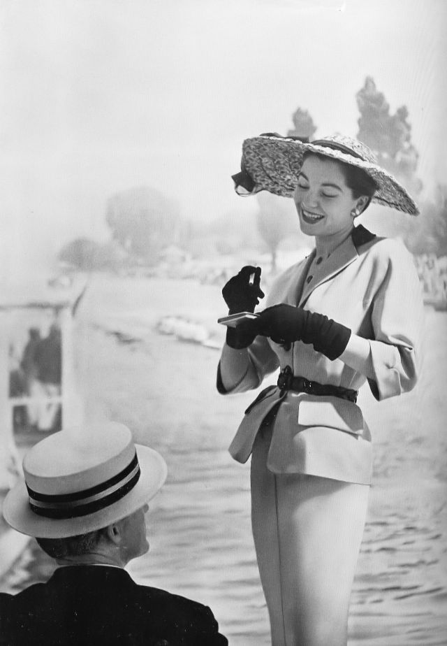 | Model in oatmeal linen suit garnished with black patent leather by Hardy Amies, shady straw hat tied with chiffon by Erik, photo by Richard Dormer, Harper’s Bazaar UK, May 1950 |