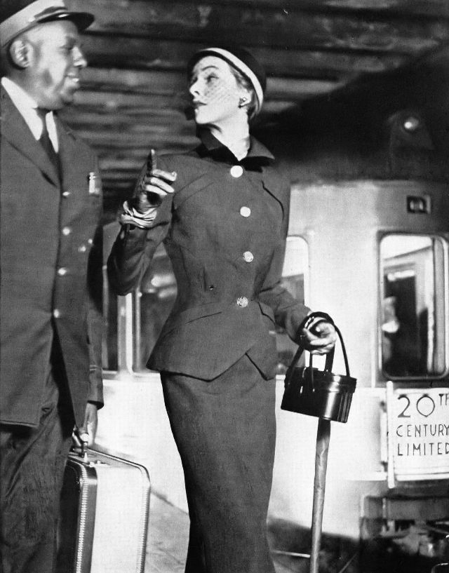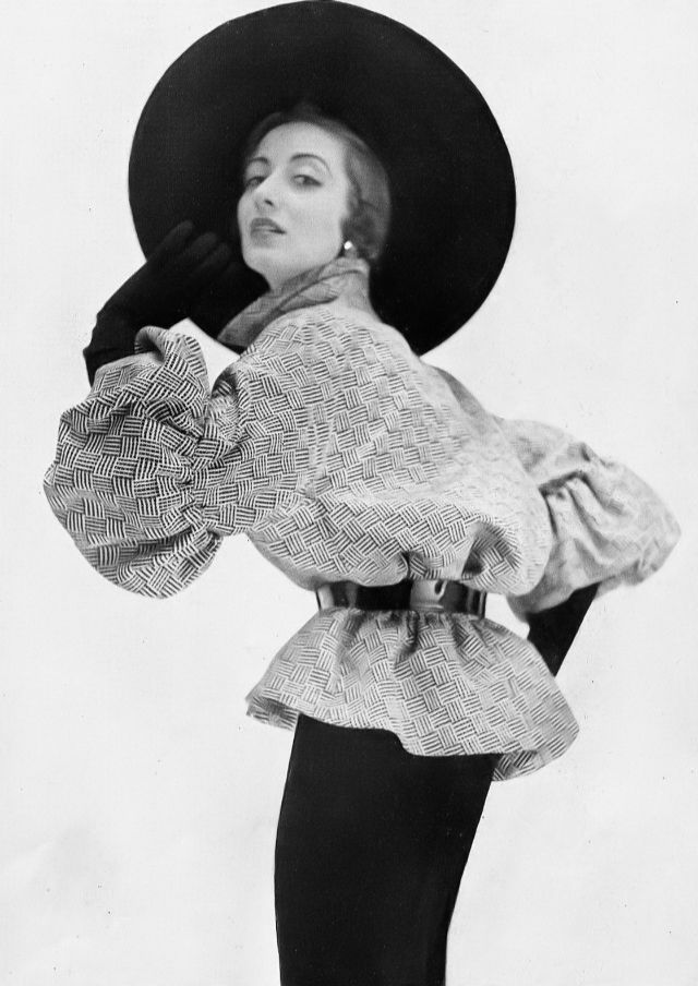 | Kathy Dennis in a worsted suit by Hardy Amies, felt hat by Mr. John, handbag by Coblentz, photo by Serge Balkin, Vogue, October 15, 1950 |