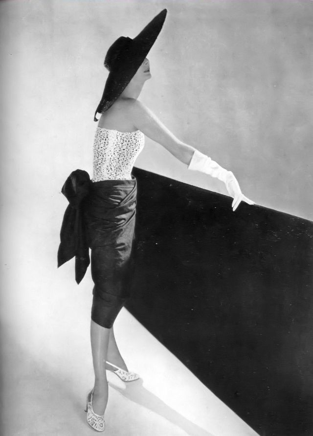 | Model in cocktail dress featuring draped skirt tied in large bow in the back with lace bodice by Hardy Amies, Vogue UK, March 1950 |
