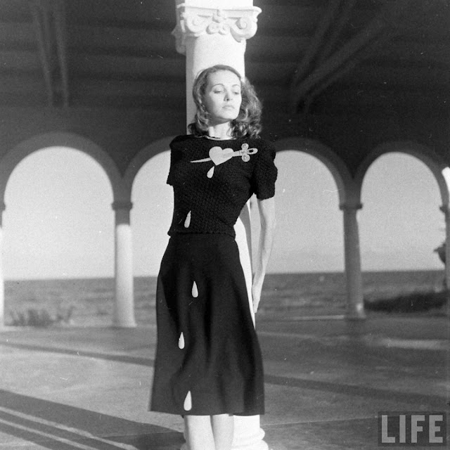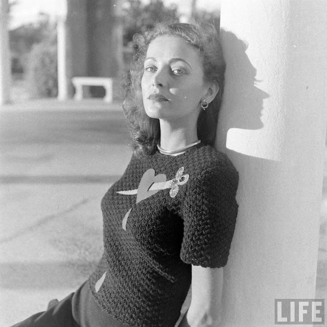 Her novelty sweaters became an immediate sensation, worn by numerous Hollywood starlets, including Barbara Stanwyck and Esther Williams, and were featured in LIFE magazine. The most famous design was the “Jezebel” sweater, which featured a bejeweled felt heart-and-dagger design, often shown as a bleeding or stabbed heart. Other variations included hearts with arrows (reminiscent of a design worn by Ginger Rogers in a 1938 film).