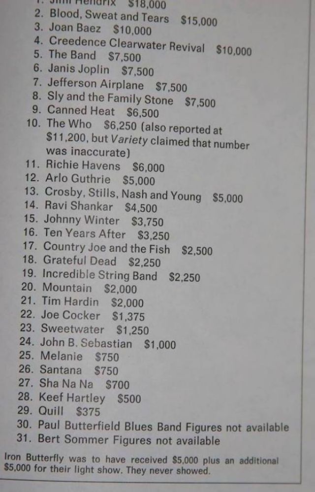 Other A-listers such as The Who and Joe Cocker took home $6,250 and $1,375, respectively. There was a lot of cash to go around, to be sure, but the event wasn’t as steep as some of today’s big-budget productions. Here’s the entire list of artists and their earnings: