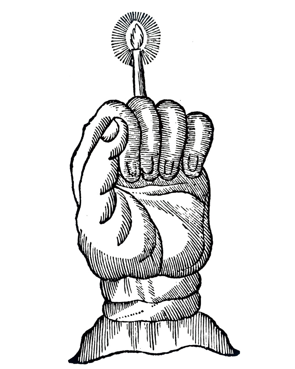 “Take the right or left hand of a felon who is hanging from a gibbet beside a highway; wrap it in part of a funeral pall and so wrapped squeeze it well. Then put it into an earthenware vessel with zimat, nitre, salt and long peppers, the whole well powdered. Leave it in this vessel for a fortnight, then take it out and expose it to full sunlight during the dog-days until it becomes quite dry. If the sun is not strong enough put it in an oven with fern and vervain. Next make a kind of candle from the fat of a gibbeted felon, virgin wax, sesame, and ponie, and use the Hand of Glory as a candlestick to hold this candle when lighted, and then those in every place into which you go with this baneful instrument shall remain motionless.”
