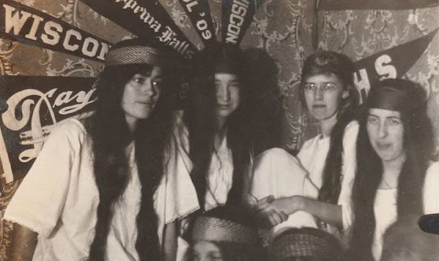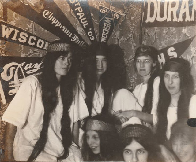Slumber Party Coeds. Based on pennants in this found photo, these look like they might be Midwestern girls in the midst of a dorm slumber party, St. Paul, Wisconsin, 1909