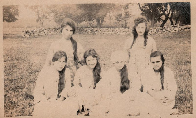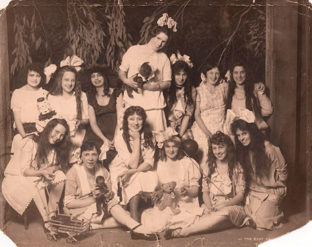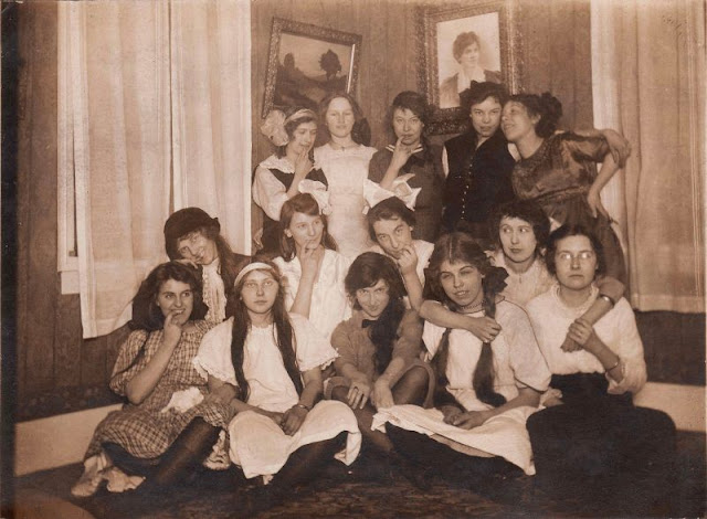 14-Girl Slumber Party. Looks likes girls just wanted to have fun even at the turn of the century. The finger-to-the-mouth gesture seems to be executed better by some than others, circa 1910