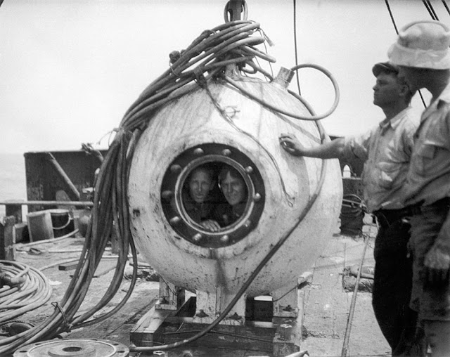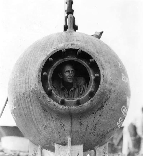 As of the late 1920s, the deepest humans could safely descend in diving helmets was several hundred feet. Submarines of the time had descended to a maximum of 383 ft (117 m), but had no windows, making them useless for Beebe’s goal of observing deep-sea animals. The deepest in the ocean that any human had descended at this point was 525 ft (160 m) wearing an armored suit, but these suits also made movement and observation extremely difficult. What Beebe hoped to create was a deep-sea vessel which both could descend to a much greater depth than any human had descended thus far, and also would enable him to clearly observe and document the deep ocean’s wildlife.