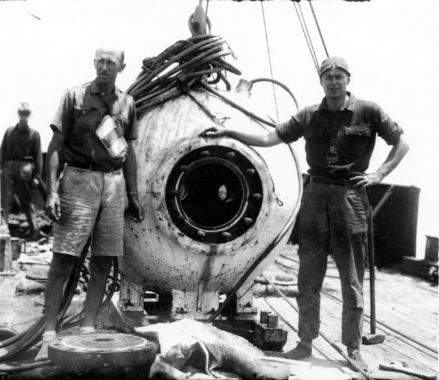 | Otis Barton (left) with William Beebe. Together, they championed and built a spherical diving submersible which Beebe described as a “bathysphere,” from the Greek “bathus” meaning “deep” and “sphaira” or “sphere”. |