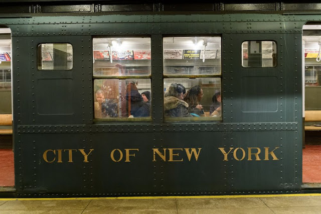 “The Holiday Nostalgia Train consists of eight cars from the 1930s that ran along lettered lines through the late-1970s. The vintage Independent Subway System (IND) cars were used by the first subway company operated by the City of New York. Modern for their time, the R1/9s complimented the IND’s Depression-Era Art Deco aesthetic. Featuring rattan seats, paddle ceiling fans, incandescent light bulbs, roll signs, and period advertisements, these are the cars that inspired Billy Strayhorn’s “Take the A Train.” Today, they are preserved as part of the New York Transit Museum’s collection.”