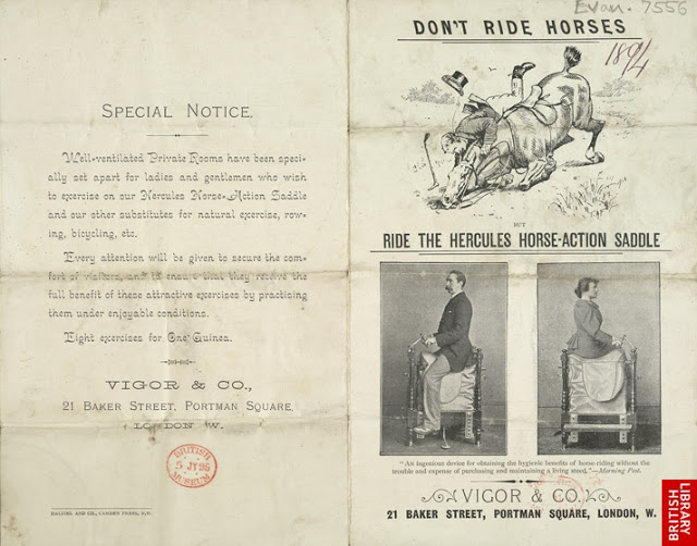Vigor’s Horse-Action Saddle, a home exercise machine, appeared on the market in the 1890s. The machine’s concertina-like casing contained four horizontal wooden platforms separated by springs. The rider’s own movements dictated the pace – an invalid could simulate a gentle walk while a more robust person could build up a furious gallop over imaginary five-bar gates. A control on the front adjusted the tension so that adventurous riders could experience a ‘bone-shaker’ feel, should they so wish. For full authenticity, riders were advised to open all the windows in the room where they were exercising. Rather than buying the machine, it was also possible to visit Messrs Vigor’s gym in Baker Street to have a go.