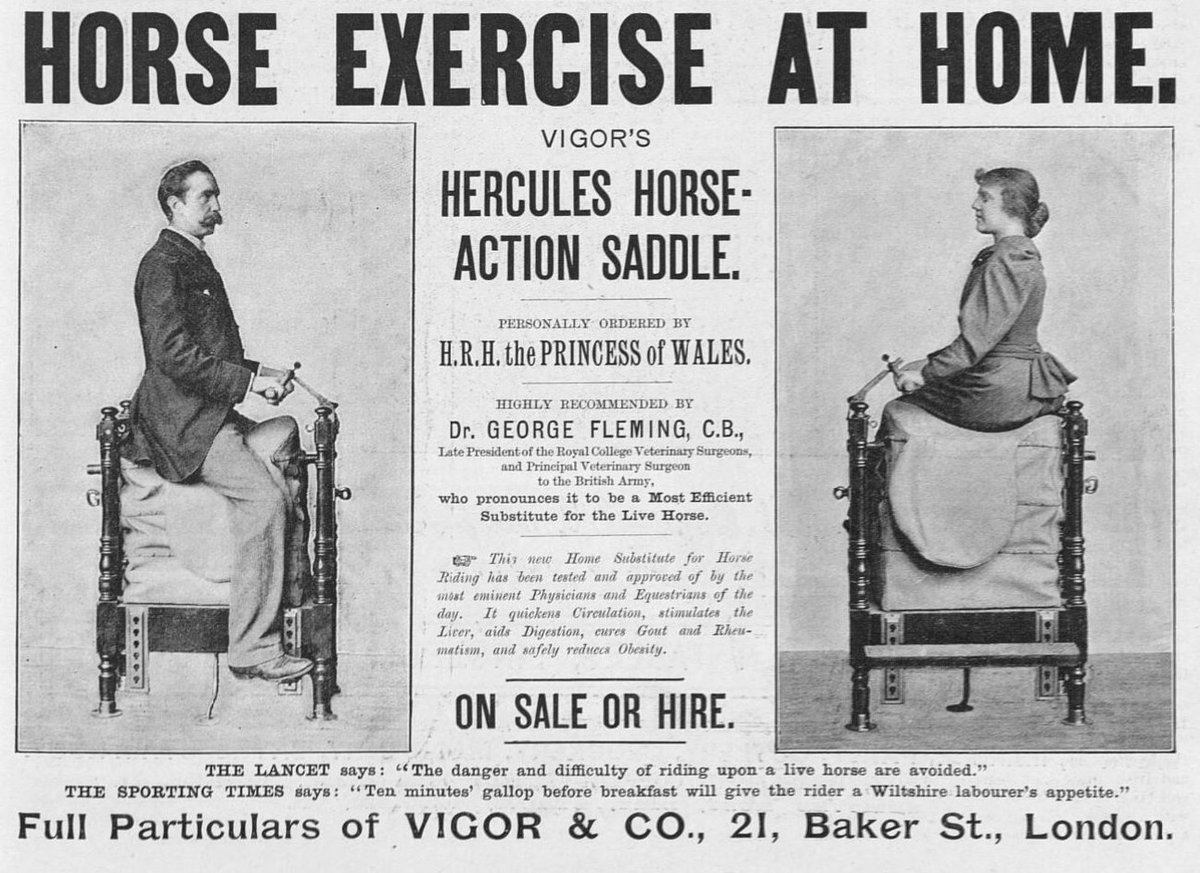 Unusually for anything involving exercise, this contraption looks almost fun. Although perhaps not completely ‘a perfect substitute for a live horse’ – at least, not if you wanted to travel somewhere – it was well-received as an aid to fitness. The medical profession increasingly advocated taking exercise on purpose to improve the health, and this product (also called the Hercules Horse-Action Saddle) appears to have given a pretty good workout.