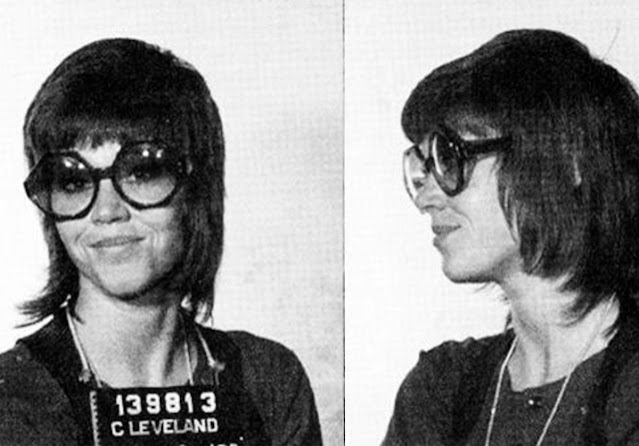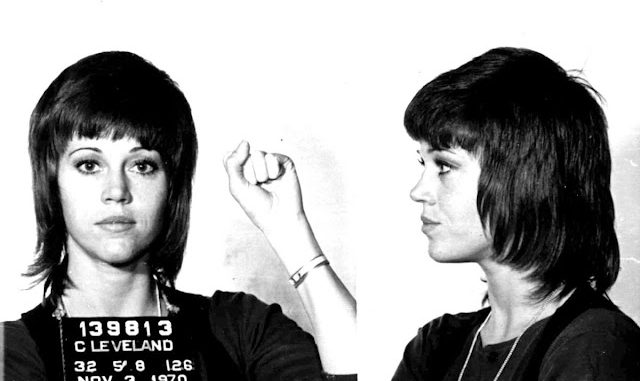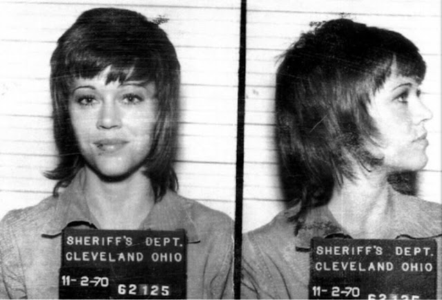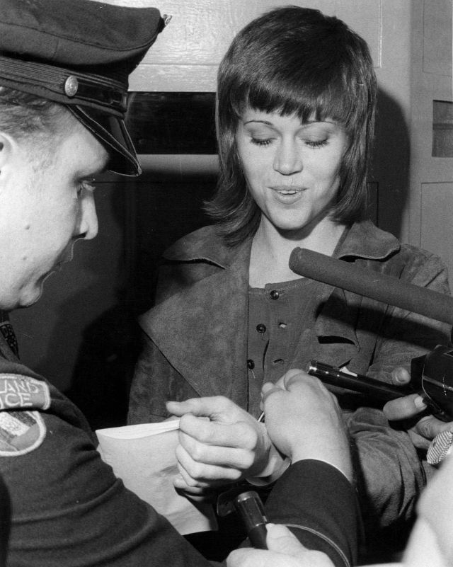 “They discovered a large bag containing little plastic envelopes marked (in red nail polish) ‘B’, ‘L’, ‘D’–signifying breakfast, lunch and dinner- that contained the vitamins I took with each meal,” Fonda wrote. “They confiscated that as well as my address book (which was photocopied) and arrested me for drug smuggling. I told them what they were but they said they were getting orders from the White House–that would be the Nixon White House. I think they hoped this “scandal” would cause the college speeches to be canceled and ruin my respectability. I was handcuffed and put in the Cleveland Jail, which is when the mug shot was taken.”