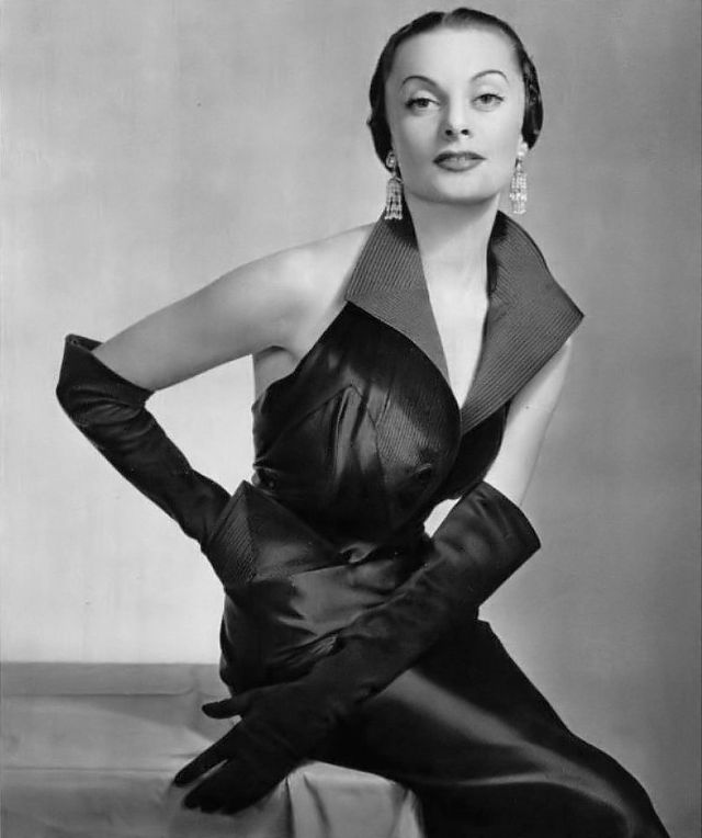 Maggy Sarrange in black satin halter dress with wide lapels by Maggy Rouff, photo by Philippe Pottier, 1950