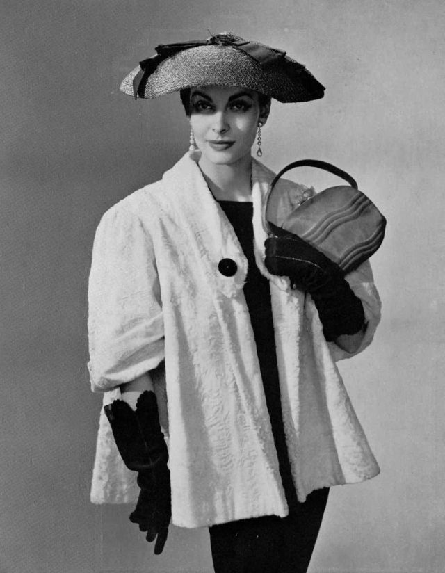 Model in white lamb’s broadtail jacket by Maggy Rouff, hat by Legroux, handbag by Violette Cornille, photo by Seeberger Bros., 1951
