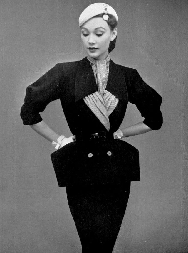 Sophie Malgat in navy blue poplin suit with lapel detail and scarf in navy and white print taffeta, by Maggy Rouff, hat by Madame Paulette, photo by Philippe Pottier, 1951