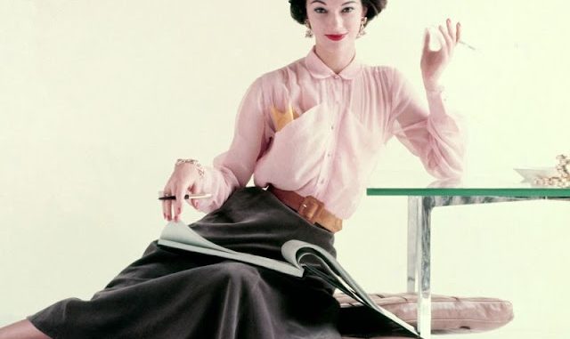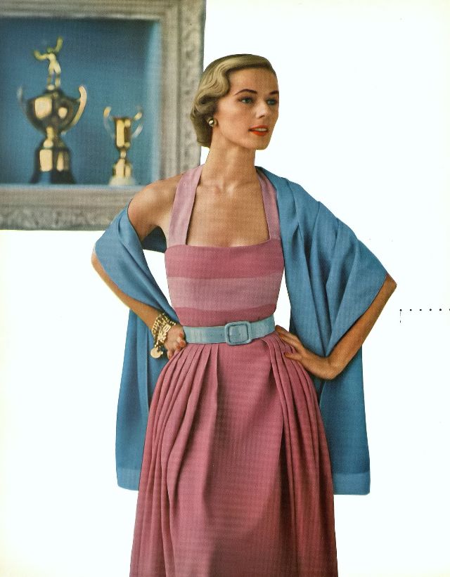 Carol McCallson in dress and shawl of denim and Celanese acetate for a soft and supple feel, by Nelly de Grab, Harper’s Bazaar, May 1951