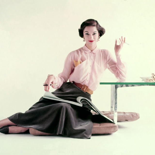 A sheer pink shirtwaist blouse and a bell-shaped skirt by Nelly de Grab, photo by Richard Rutledge, 1952