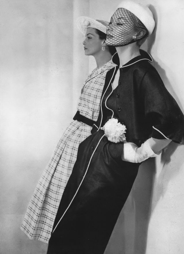 Eva Gerney (l) and Lisa Fonssagrives in linen separates by Nelly de Grab, white straw sailor by Harryson and veiled pillbox by Betmar, photo by Horst P. Horst, Vogue, March 1, 1950