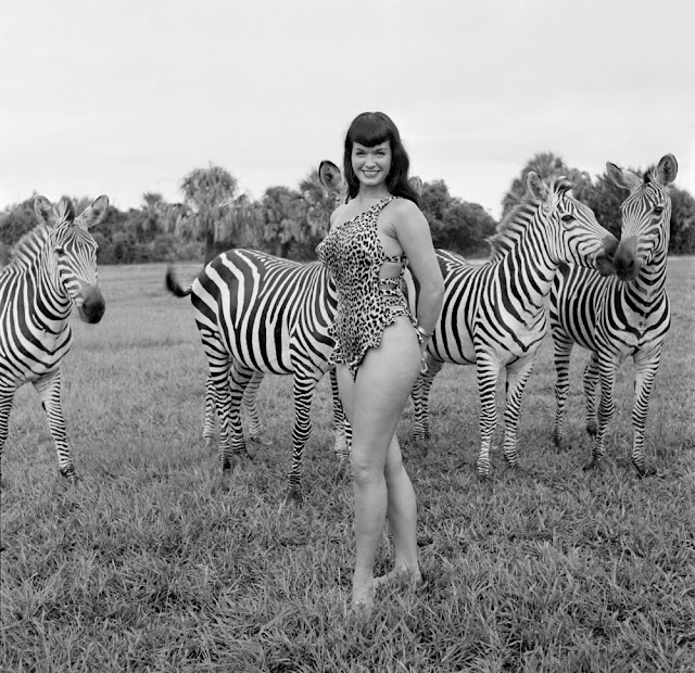 In 1954, during one of her annual vacations to Miami, Florida, Page met photographers Jan Caldwell, H. W. Hannau and Bunny Yeager. At that time, Page was the top pin-up model in New York. Yeager, a former model and aspiring photographer, signed Page for a photo session at the now-closed wildlife park Africa USA in Boca Raton, Florida. The “Jungle Bettie” photographs from this shoot are among her most celebrated. They include nude shots with a pair of cheetahs named Mojah and Mbili. Page herself made the leopard-skin-patterned jungle girl outfit she wore, along with much of her lingerie.