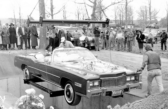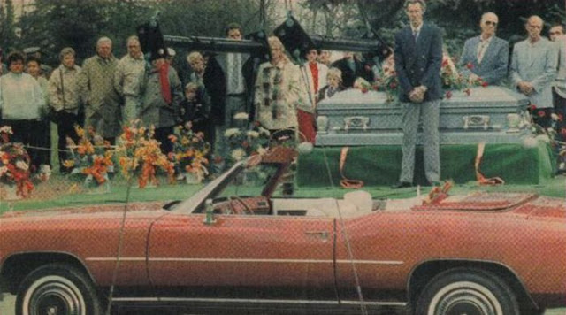 Aurora Schuck loved her red 1976 Cadillac convertible so much that when she died in 1989 she was buried in the back of it. According to newspaper articles it took 14 burial plots and the hole measure 27 feet long, 12 feet wide and 6 feet deep.