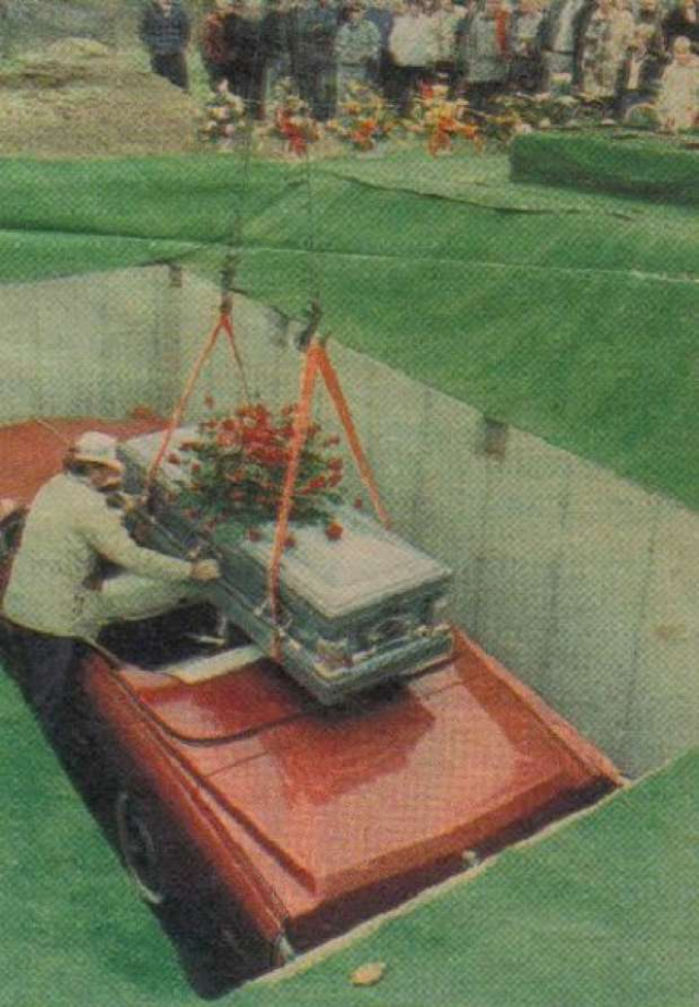 A crane was needed to lift the Cadillac with its top down into the vault. Aurora’s casket was then set atop the car.