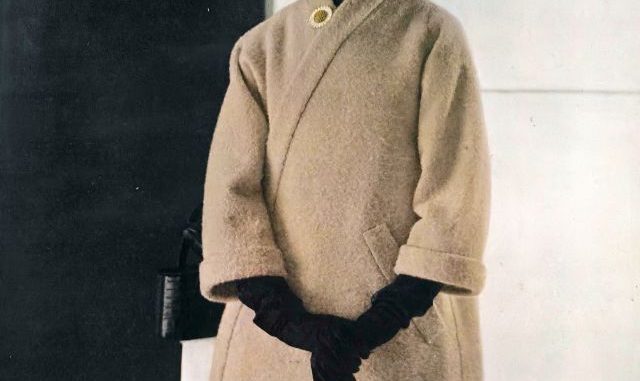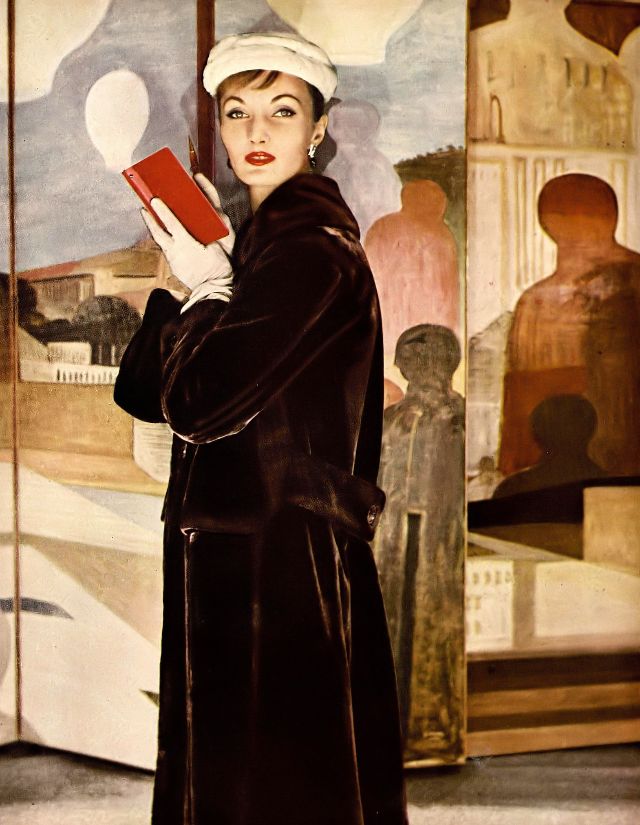 Evelyn Tripp in Alaska Sealskin polo coat with flap pockets and low half-belt by Fredrica, ermine toque by Irene of New York, photo by Louise Dahl-Wolfe, Harper’s Bazaar, November 1955