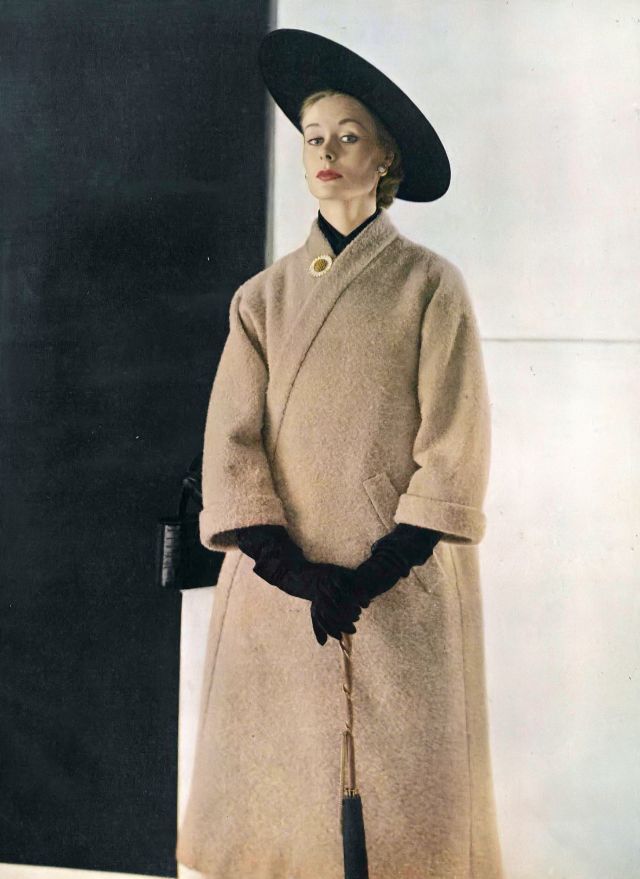 Nina de Voogt in coat that wraps closely or hangs loosely of wheat wool tweed by Ben Zuckerman, black silk organdy sailor by Irene of New York, photo by Horst P. Horst, Vogue, February 1, 1952