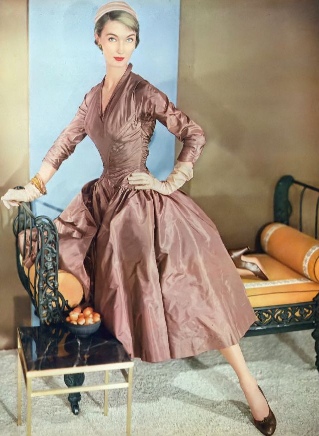 Evelyn Tripp in wonderful, peau-de-soie dancing dress with a long moulded torso, in a mixture of beige and brown by Ceil Chapman, small pink satin hat by Irene of New York, photo by Horst P. Horst, Vogue, September 15, 1954