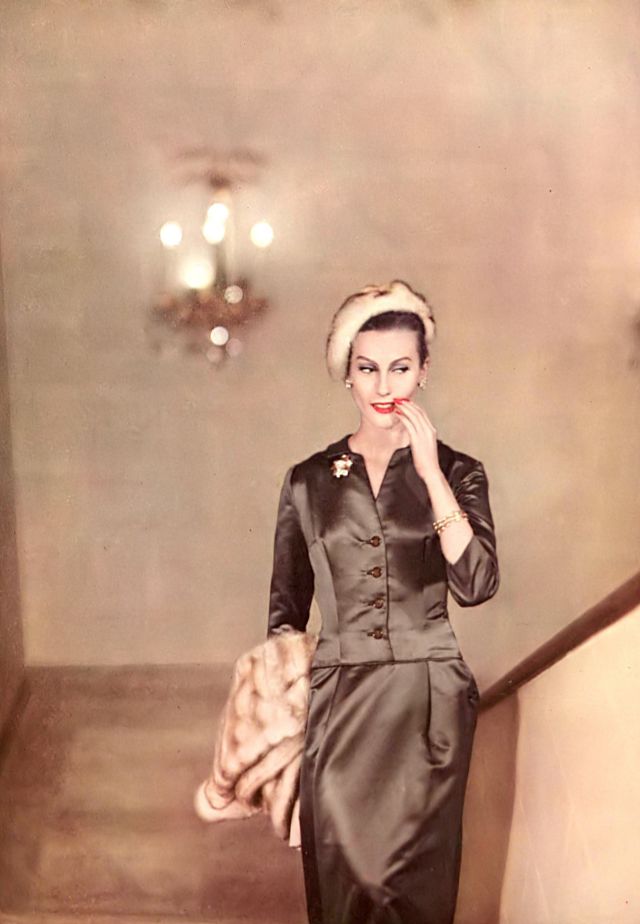 Mary Jane Russell in gently tailored taupe satin suit by Ben Barrack, fitch beret by Irene of New York, jewelry by Verdura, photo by Karen Radkai, Vogue, September 15, 1955