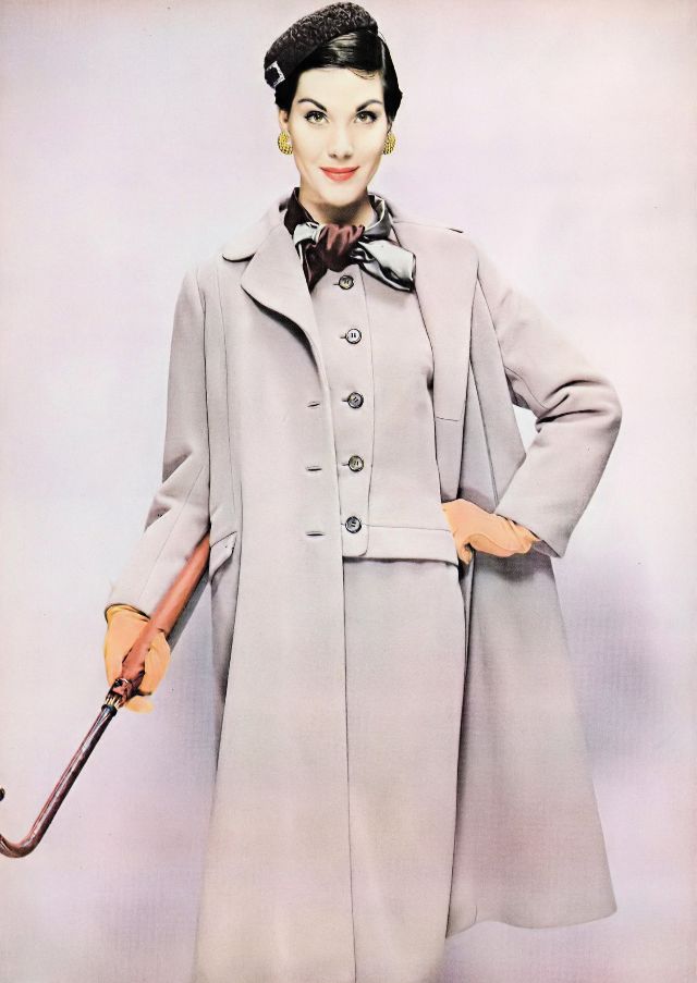 Model in Anglo wool suit with a 7/8 length topcoat by Ben Zuckerman, Karakul tambourine by Irene of New York, Kislav gloves, photo by Erwin Blumenfeld, Town & Country, September 1955